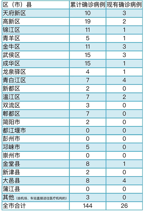 截至3月12日24时,成都市累计报告确诊病例144例,累计出院115人,死亡3人,其余26人均在定点医院隔离治疗,75名密切接触者正在接受医学观察。