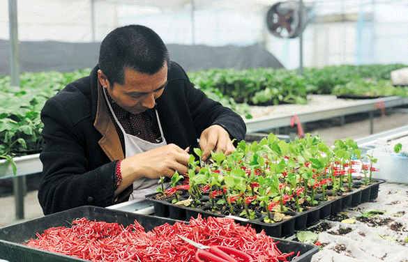 短小粗壮的茎托起细嫩的苗,一个普通的小夹子成了维系二者的纽带,迎着光的方向叶片自由舒展生长,底部发达的根系经过半个多月的培养,快要撑破穴盘一方小小的空间……走进专业化温室大棚,记者看到,不同于常规的蔬菜大棚,这里更像是一个蔬菜手术操作室。忙碌的农人手中挥舞的不再是司空见惯的镰刀锄头等农具,而是一片薄薄的刀片,和随之用以固定嫁接口的夹子。