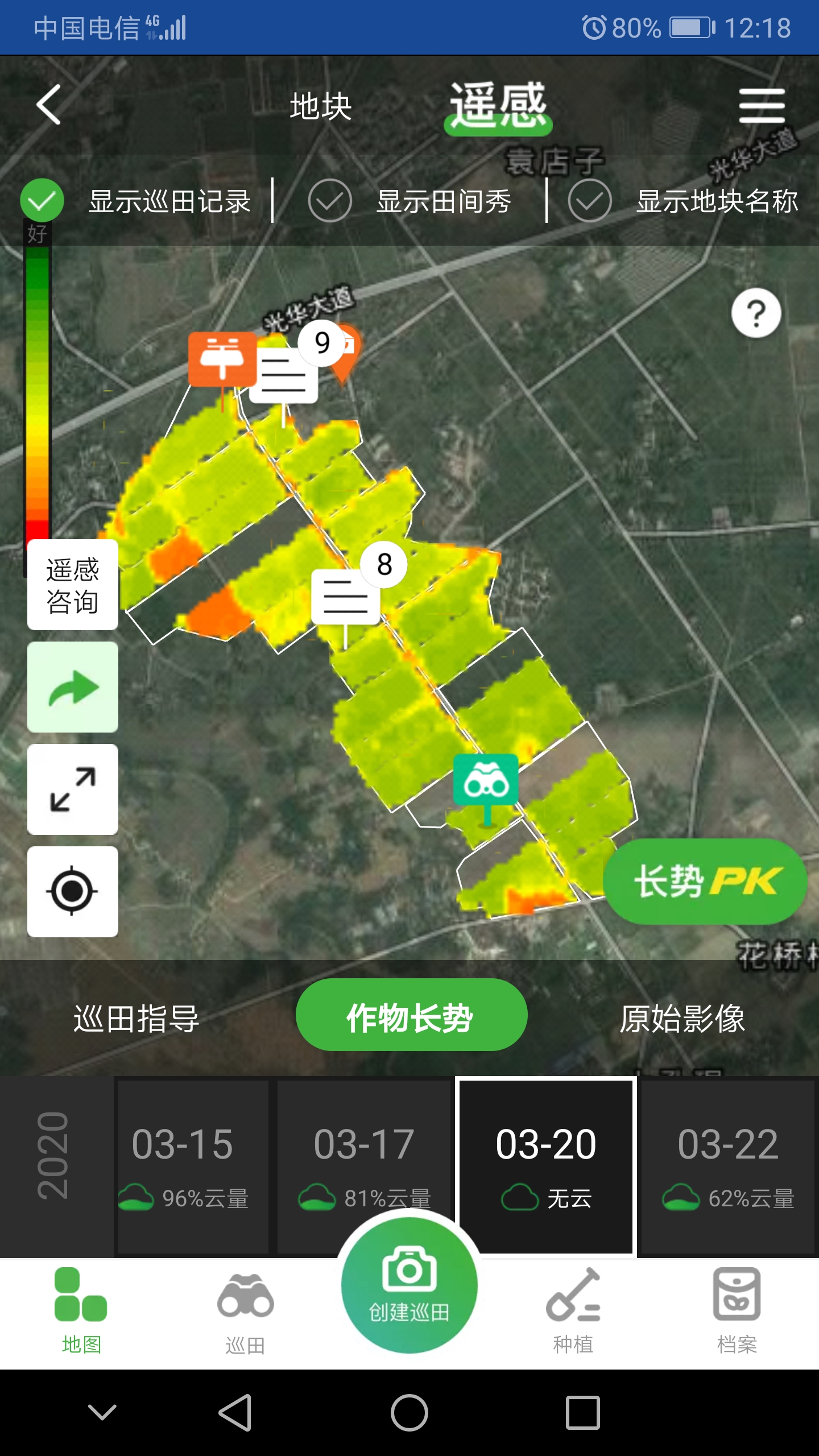 中化农业工作人员阳杰说:“智农APP里,绿色的田块表示作物长势较好,红色田块表示作物长势较差,通过实时的监测分析,可以提前做好病虫害的预警。”