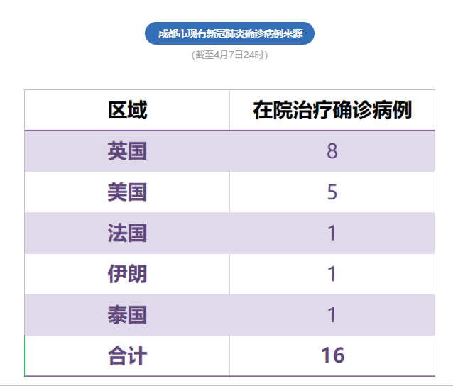 截至4月7日24时,成都市累计报告确诊病例165例,累计出院146人,死亡3人,其余16例境外输入确诊病例正在定点医院隔离治疗。全市尚在集中隔离医学观察的无症状感染者7例,其中境外输入6例。