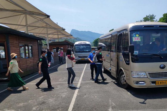 “早上好!欢迎来到天台山,请您出示健康码或通用绿码”,在景区游客中心,工作人员为每一位进入景区的游客扫码,在该景区售票大厅里,取票的游客有序地排着队,大厅外,大巴车、自驾车辆在工作人员指挥下有序停放。景区还临时增派了30余名保安人员,协助引导游客间隔入园、有序排队,扫码测温,有序进入景区。针对少数未预约前往景区游客,咨询人员耐心解释;夜间,景区秩序维护人员继续奋战,疏导交通,保证游客有序观赏萤火虫;景区保洁人员按时对公共设施消毒,为游客提供舒心安心的游览环境。
