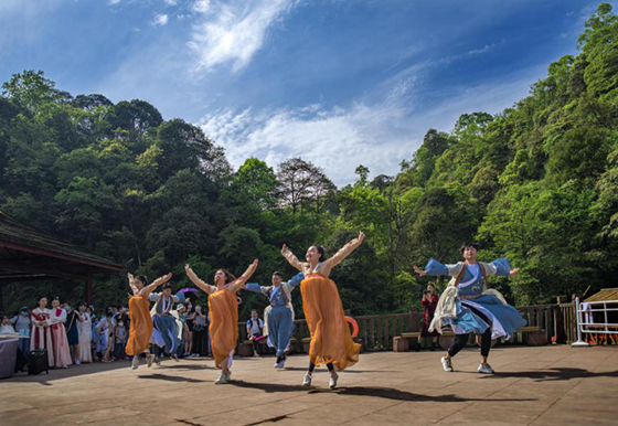 “五一”的5天假期,游客强烈的出游欲望,加之高温天气,天台山景区成为成都近郊游首选,这对天台山景区来说是一场前所未有的‘大考’,景区提前谋划,坚持“三限三保两通道”原则,即提前网络预约限人,远端高速出口限车,近端游客中心限流; 强化运力保障、通讯保障、医疗保障;开通一日游通道,二日游通道,始终把游客健康安全放在首位,全面做好疫情防控,安全管理、游客服务工作,五一假期天台山安全平稳有序运行。森林音乐表演