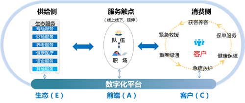 服务生态(E)是服务供给方,聚焦客户的保障场景需要,有效整合相关内、外部资源,按照扁平化方式运作,打破层层传递的壁垒,借助数字平台直接向服务前端供给保险生态服务。