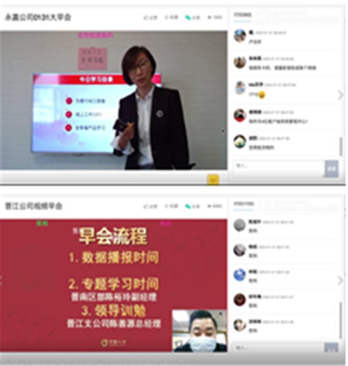 疫情期间,各级机构更是依托数字化平台开展大量科技创新,以数字化方式助力全面复工复产,激发了销售伙伴线上经营服务的热情。开启视频直播早会新模式。中国人寿的分支机构遍布全国,特殊时期,为应对各级单位快速开工、恢复经营的迫切需要,依托公司内部视频直播平台开展销售团队大早会,各项工作要求快速到位。疫情期间,日均召开各类线上直播超过2200场,累计播放超过3000万人次。创新线上智能销售训练。应用AI技术,通过人机对话方式,销售人员可自主进行线上训练与通关,该功能率先在疫情最严重的湖北等地区应用,实现了非常时期销售训练工作的正常开展。推出职场智能实时业绩播报。为更加有效地支持职场经营,公司面向全国近两万余个职场推出云助理智能业绩播报功能,每日8:00~24:00以每小时为间隔,实时播报业绩战报、增员动态、产品宣导、早会预报等信息,让销售伙伴第一时间获取最新资讯,助力职场快速获取业绩动态,振奋职场氛围,提升展业动力。各项功能推出受到广大销售人员的热烈欢迎,成为日常精细化、实时化管理的必备数字工具。(疫情期间各类创新线上经营场景如图4所示)