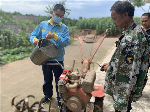 “家里急着耕地,你们就给送来了油,真是帮了大忙!”6月初,在中江县辑庆镇飞龙村,交投国储公司中江服务区加油站员工将桶装柴油手动加注到翻地机里,村民们喜笑颜开、连声道谢。