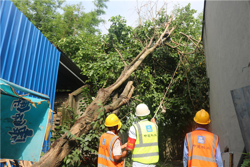 6月29日,中建科工锦城绿道项目党支部党员志愿服务队为华兴街道三河社区居民解决难处,移除倾倒危险树木,消除安全隐患,将初心使命化作行动,帮扶基层困难群众。