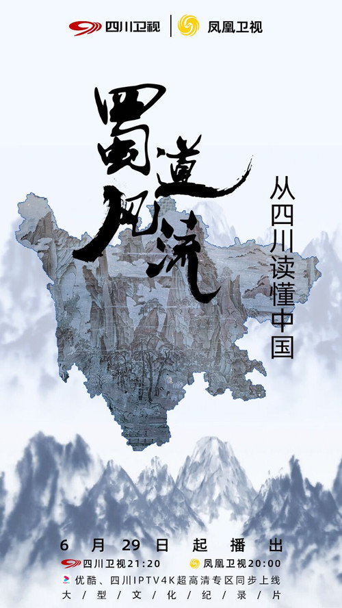 《蜀道风流》共10集,将于6月29日起,每晚21点20分在四川卫视播出、每晚20点在凤凰卫视播出,优酷、四川IPTV 4K超高清专区同步上线。该片每集篇名均以诗句构成,“尔来四万八千岁”“天生襟度容江海”“不可居无竹”等,从不同侧面彰显四川文化中的浪漫气息和历史厚度。
