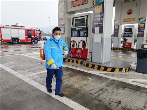 大年三十晚上20:23,一辆鄂A牌照的小轿车驶入金堂服务区加油站,胡明剑抢着就小跑上前:“师傅,您从湖北赶回来过年啊?您辛苦了,您也知道现在疫情发展的很迅速,我给您和车上人员测下体温,放心,不耽误事,我们这还有口罩、消毒洗手液、常备感冒药、热水等,都是免费的,您如果有需要就告诉我,我立即给你送来。”确认司乘人员无异常情况,当加满油的车辆驶出后,他立即对加油岛及加油设备进行全面消毒清理,并对车辆情况进行登记上报。这是他每天工作中最常见的一幕,作为副经理,他不仅要协助统筹安排全站各项日常工作,更始终坚持身体力行、冲锋在前。
