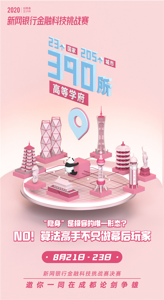四川新闻网成都8月14日讯 近日,2020“创青春·交子杯”新网银行金融科技挑战赛初赛传来捷报。本次大赛云集了海内外23个国家、205个城市、390所高校、2000多位极客报名参赛。