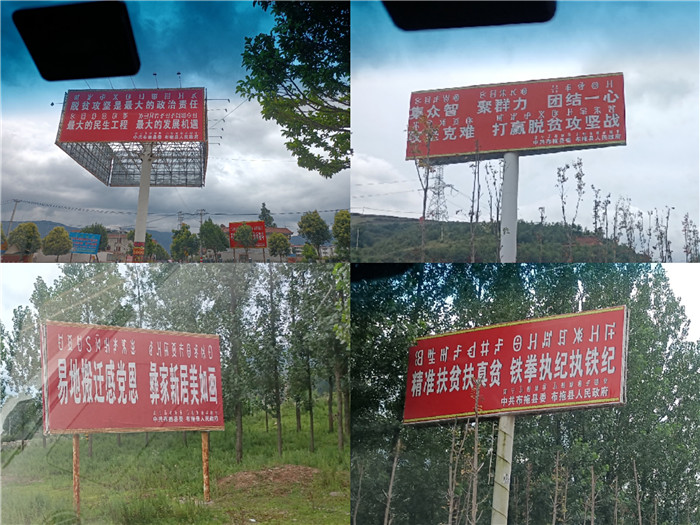 汽车驶入阿尔马之村的沿途悬挂着许多脱贫攻坚的标语