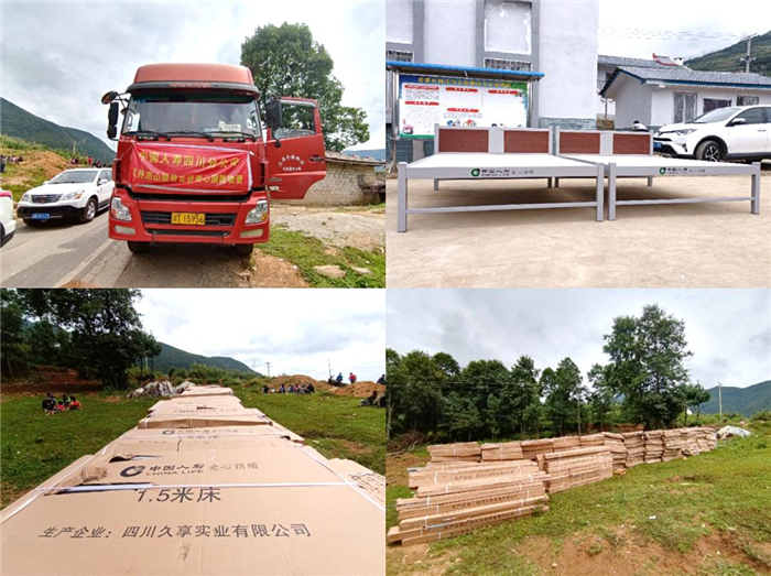 大巴车运送778张由四川国寿捐赠的简易钢架床到阿尔马之村