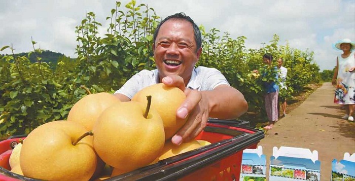 “有机肥施得多,雨水又足,足足增产了10000公斤。”复兴梨园负责人邓朝轩看着一个个硕大的黄金梨,笑得合不拢嘴。记者获悉,为振兴乡村观光旅游资源,创新乡村发展理念,“复兴梨园农民专业合作社”成立之初,从韩国引进黄金梨,从日本引进圆黄梨、丰水梨,对现有苍溪雪梨进行更换改良,既保留了原有苍溪雪梨的优势,同时三个品种互相授粉,通过常年施用有机肥及无公害无残留的有机农药,自创出现在“皮薄核小、肉质细嫩、水分多、糖分足”的香帅梨。