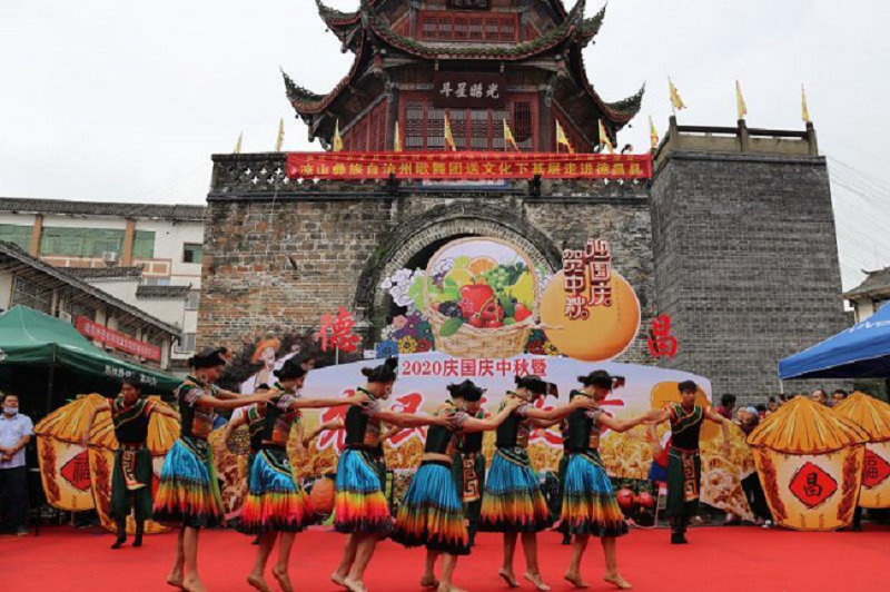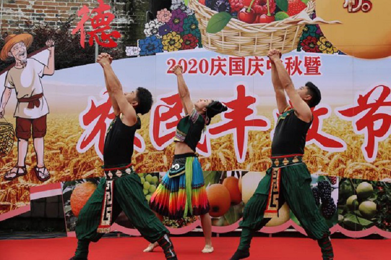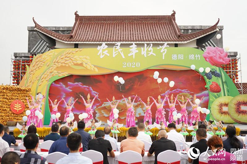 9月18日,德阳市2020年农民丰收节在绵竹孝德镇中华年俗村隆重举行。一首节奏欢快的舞蹈《喜庆丰收》拉开了丰收节的帷幕,文艺表演、农民运动会、游园活动、德阳乡村振兴建设成果展、特色优质农产品展销等系列精彩活动,让大家热热闹闹喜庆丰收。(图源人民网)
