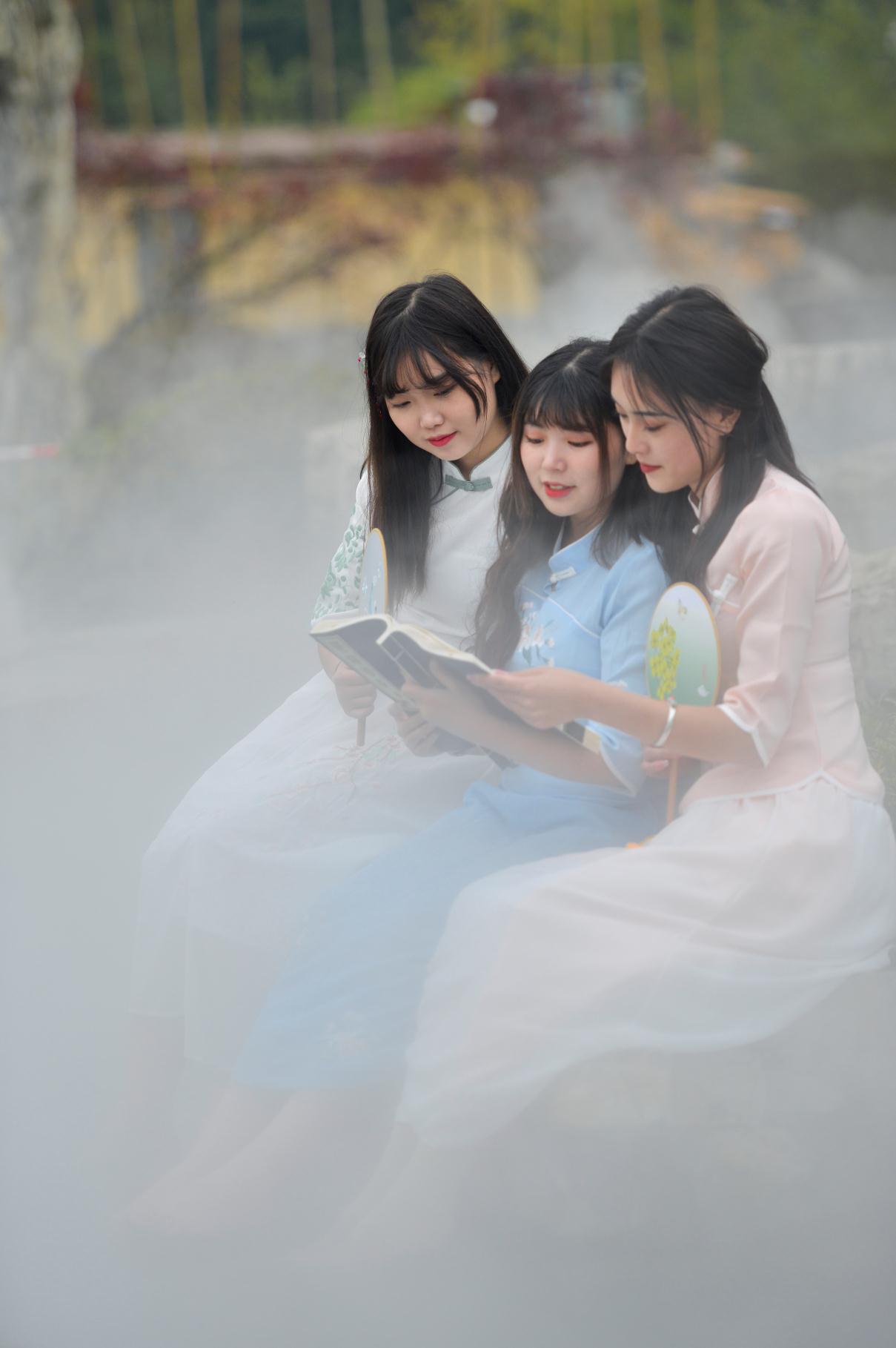 一群身着粉色、蓝色、白色传统服饰的少男少女,在花丛中吟哦,在小溪畔阅读,在田野中分享阅读的快乐。