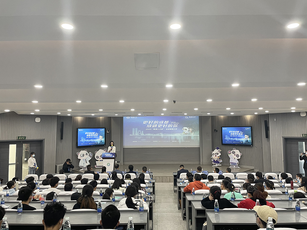 在湖南大学的复临舍报告厅,崇州市委常委、组织部部长余家洪专题推介了崇州发展环境及人才政策。近200名求职学生全神贯注,认真了解崇州对人才的礼遇和在崇发展前景。
