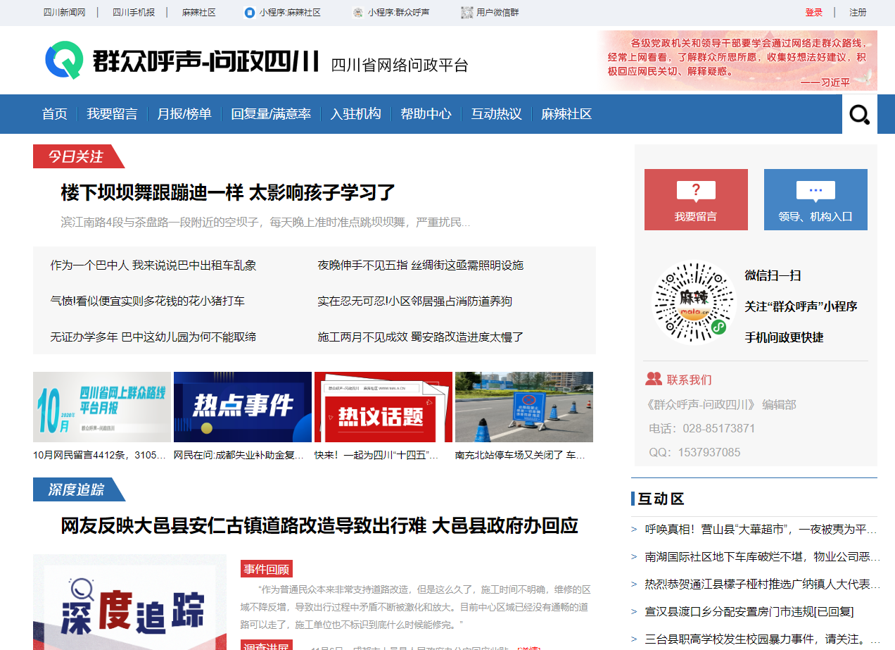 以网络问政平台为代表的网上群众路线,日趋成为强化党群关系的主要渠道之一。其实,除了人民网的《领导留言板》之外,四川新闻网传媒集团麻辣社区也早已成为了万千网友的老朋友、好朋友。在四川省委宣传部、四川省互联网信息办公室的指导下,麻辣社区“群众呼声-问政四川”网络问政平台(https://wz.mala.cn/)目前已成为四川各级政务机构通过网络走群众路线、了解民情民意的主要渠道,也是全国最有影响力的网络问政平台之一。