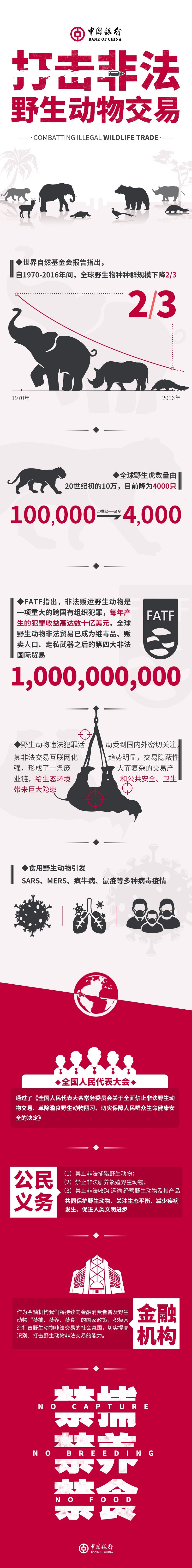作为金融机构,中国银行将持续向金融消费者普及野生动物“禁捕、禁养、禁食”的国家政策,积极营造打击野生动物非法交易的社会氛围,切实提高识别、打击野生动物非法交易的能力。