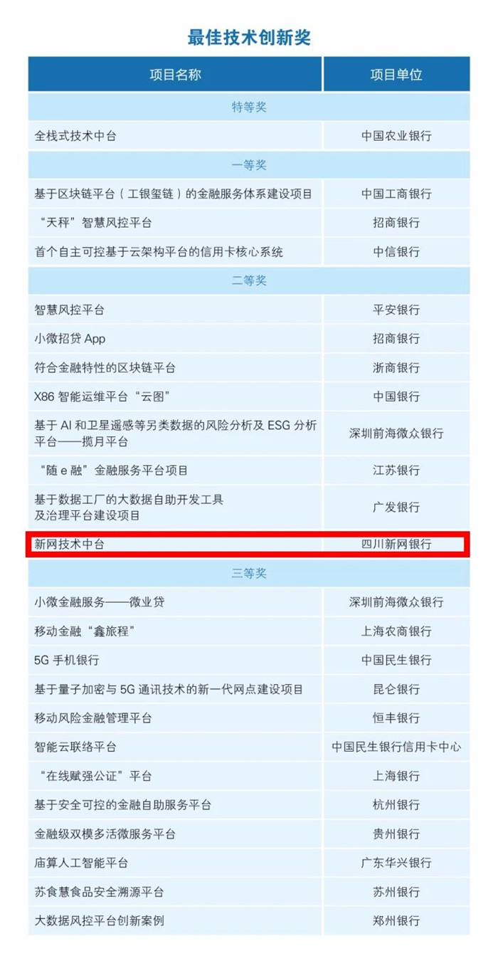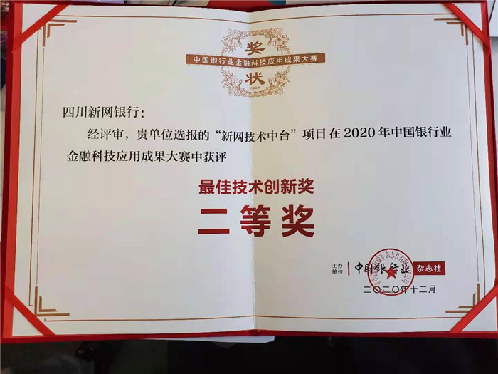 四川新闻网成都1月22日讯 近日,由中国银行业协会、中小银行互联网金融(深圳)联盟指导、《中国银行业》杂志主办的“2020年中国银行业金融科技应用成果大赛”评选结果正式揭晓,新网银行“新网技术中台”的创新案例荣获大赛“最佳技术创新奖”二等奖。
