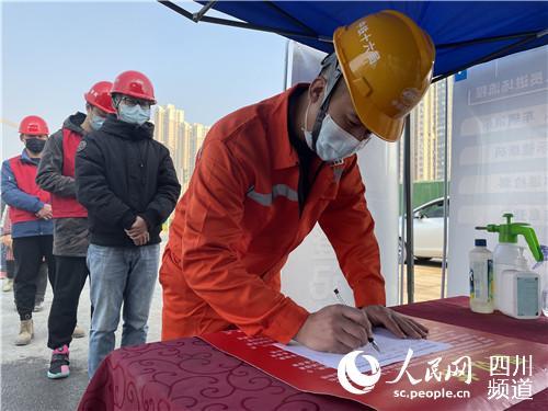 成都地铁17号线项目工地上,员工参加倡议签名。人民网 记者 李平摄