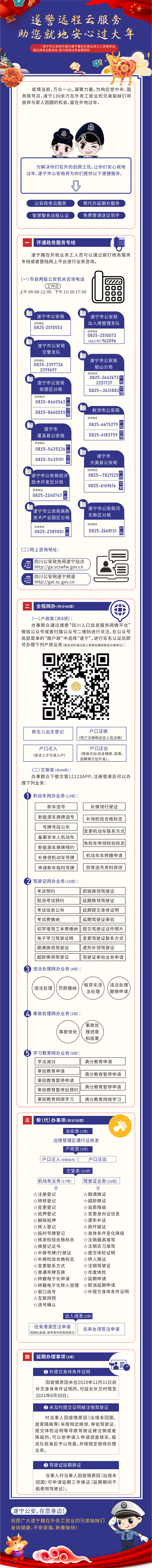 为做好春节期间疫情防控工作,积极响应国家就地过年的号召,全市公安机关在全国公安系统率先开展“遂警远程云服务,助您就地安心过大年”主题服务活动,主动为遂宁籍在外就业务工人员提供“网上办”“远程办”“帮(代)办”等便民服务,切实解决他们的工作、生活后顾之忧,就地安心过大年。