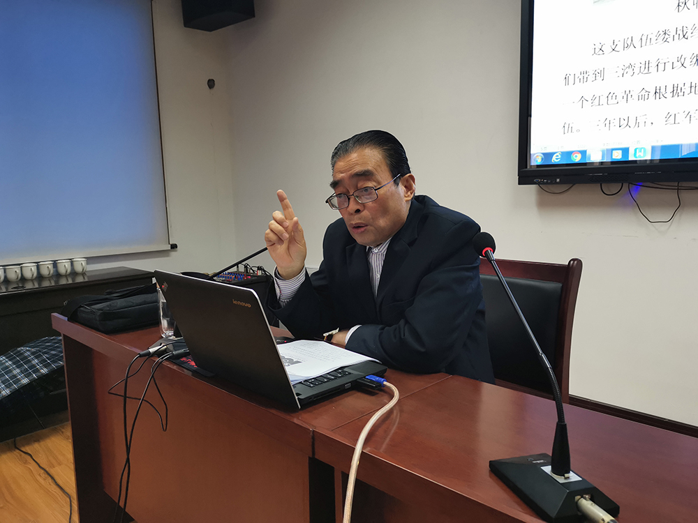 忆当年、谈今朝,崇州市老年大学常务副校长、临时党支部书记、有着56年党龄的党员柳永明以“向党的隐蔽战线的同志致敬”为主题,紧紧围绕初心和使命,结合自己的亲学亲历亲闻、所思所想所感,讲党史、讲初心,讲红色故事。