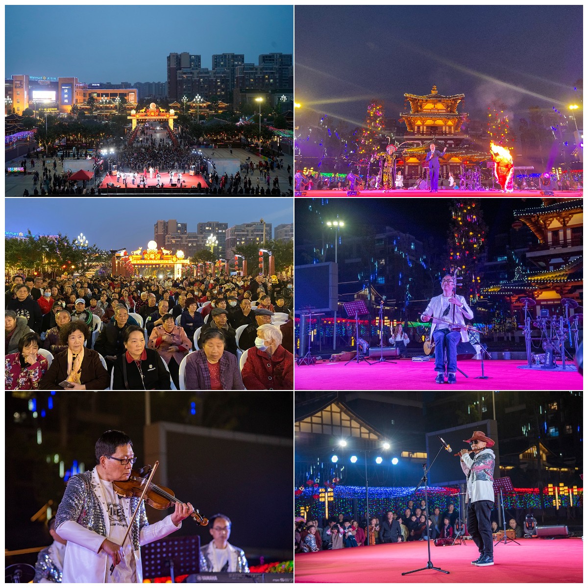 演出由崇州市文化馆轻音乐团的演奏拉开序幕。紧接着,一场川剧变脸点燃了全场的气氛,吸引了不少市民驻足观看,一同观赏这场丰富的文化盛宴。歌曲,舞蹈,乐器演奏,节目形式多样,老少皆宜,不仅有耳熟能详的《青藏高原》《爱你在心口难开》等经典歌曲演唱,还有小提琴、笛子、萨克斯等乐器演奏和精彩的藏族舞蹈,悠扬的歌声在夜空里回荡,绚丽的舞台灯光也给演出营造了良好的氛围。不少市民举着手机拍下精彩瞬间,现场气氛热烈,观众掌声不断。