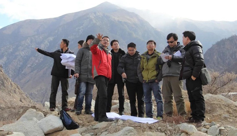 其实早从2010年开始,何娘者便带领着技术人员深入川藏沿线进行实地踏勘。工作20多年来,亲临每处重要线位是何娘者的职业坚守。他带领技术人员脚踩着肩、头顶着人,慢慢从近乎垂直的陡壁上滑到谷底线位。期间,不时有松软脱落的石块儿从山顶滚落,大家尽量把动作放缓,小心翼翼地前行。突然,一块碾子大小的飞石嗖地砸了下来,与地面撞击产生的碎石像雨点般四处飞溅,大家措手不及,身上多处被砸伤,现在想起来都还后怕。