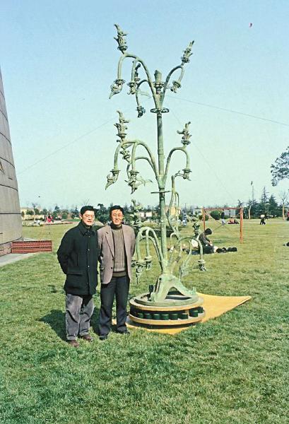 陈德安(右)与修复完成的青铜神树。受访者供图