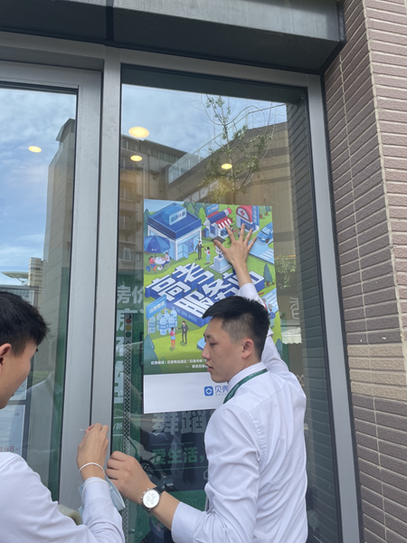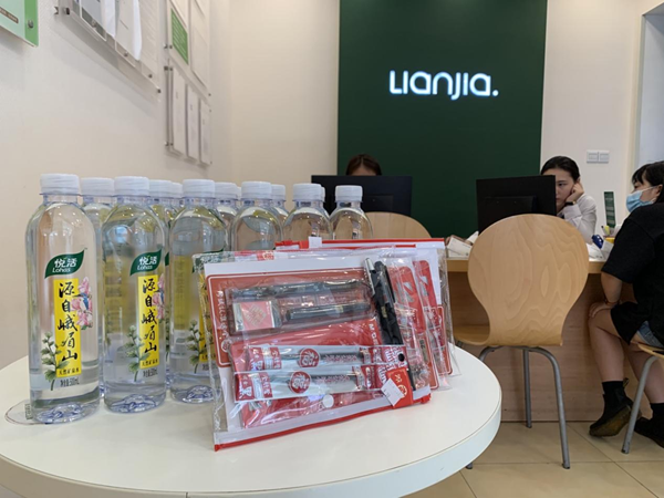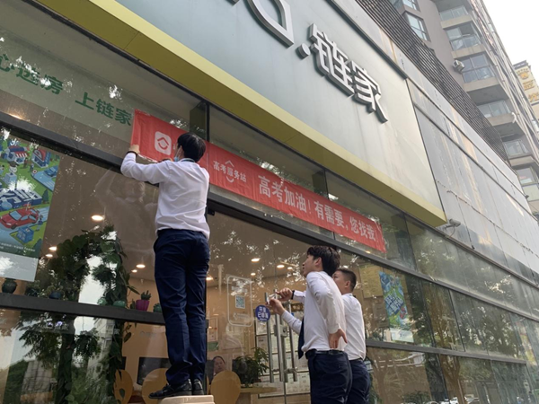 6月4日下午6时,在盐道街中学外,成都链家雕墅店经纪人们刚结束一天带看,就在商圈经理孔满意的带领下,对门店进行打扫和布置,他们挂上印着“高考服务站”的吉利横幅,张贴出有免费服务内容的海报,在店内摆好瓶装矿泉水,备好崭新的文具包,还给打印机换好了油墨和打印纸。
