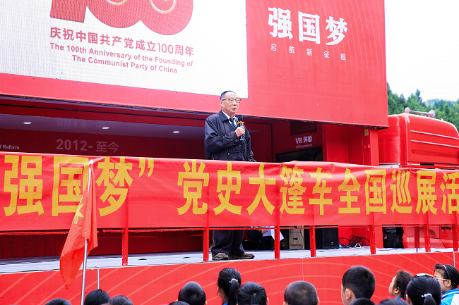 “同学们,幸福生活来之不易啊!你们一定要珍惜,好好学习,将来报效祖国。”在大篷车的讲台上,有着61年党龄的老党员赵均国对台下的小学生深情叮嘱,也拉开了党史大篷车苍溪站活动的序幕。赵均国是中共苍溪县委办公室原主任,当天特意赶到了现场,向来此参观党史大篷车的小学生讲起了党史。在赵均国的讲述中,这场历时24天,共歼国民党军12个团多约1万人,攻克县城8座的伟大战役浮现眼前,让台下的孩子们备受鼓舞。