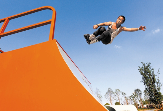 成都露天音乐公园内,橙色的极限运动场地里,喜爱轮滑的年轻人正在烈日下挥洒青春的活力与汗水