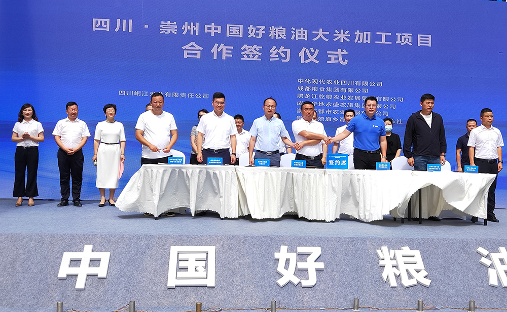 在当日的签约仪式上,四川岷江米业有限责任公司与中化集团、黑龙江乾粮农业发展集团、成都粮食集团有限公司、成都华地永盛农旅集团有限公司、崇州都市农业产业投资公司、土地股份合作社及新型经营主体现场签订合作协议,合作协议资金达1.2亿元,打造都市农业功能区产供销全产业链联合体。
