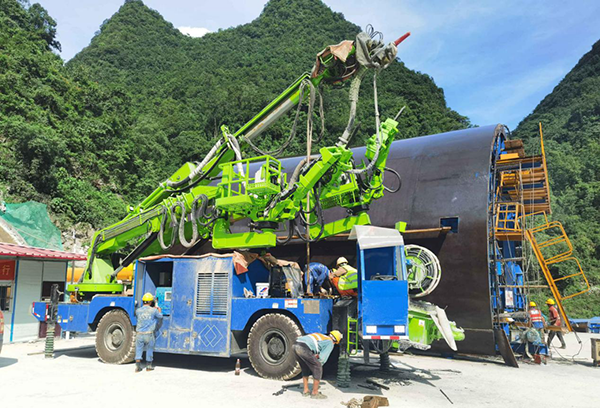 全电脑三臂凿岩台车具备全自动高效钻孔功能和钻进长度超过30米超前钻探功能,3个工作臂同时钻孔,每个工作臂可在2分钟内自动完成5m深钻孔作业,较传统施工可减少8名作业人员,并缩短每循环钻孔时间1.5小时。