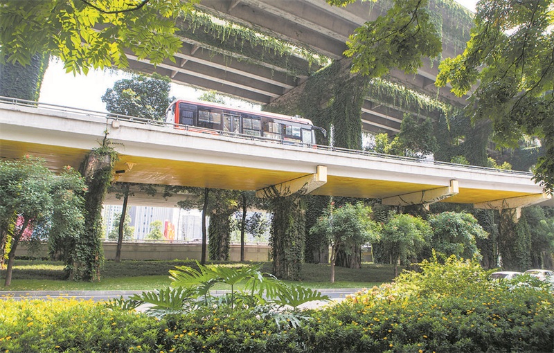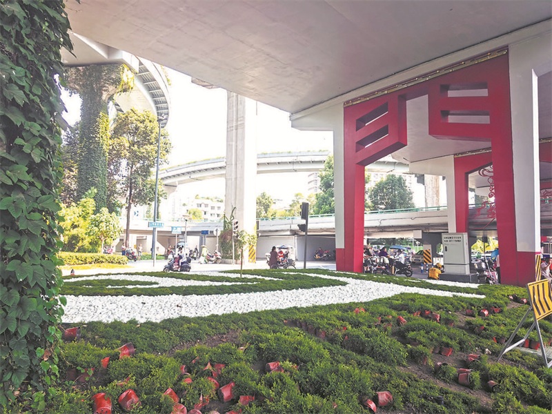记者在营门口立交桥下看到,巨大的桥墩被绿色爬山虎包裹了起来,仿佛一株株高耸的大树。桥下是精心设计的绿化景观和微型公园,桥上汽车来往轰鸣,桥下鲜花随风摇曳,“门”字景观雕塑,与绿植、桥体和道路一起,形成了一座立体的空中花园。