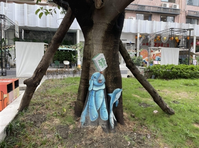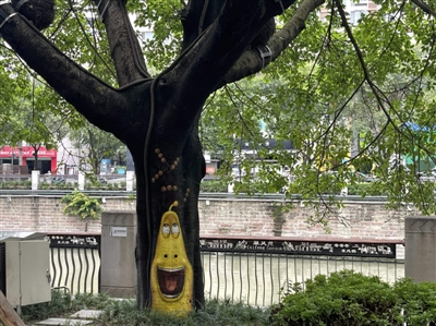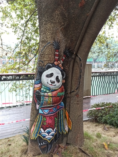 走在锦江边上,一边吹着凉风,一边感受改造后的望平滨河路,便被树上的画吸引了。树上的图案以成都元素和动画片为主,如大熊猫、川剧变脸等,吸引市民驻足观赏。走上前仔细观察会发现,这些图案在描绘时,不仅没有破坏树木的生长形态,甚至连树干上面的树疤、树瘤、创伤都做了很好的处理。