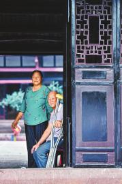 8月19日夜晚,肖太发老人拄着拐杖在院内巡护。