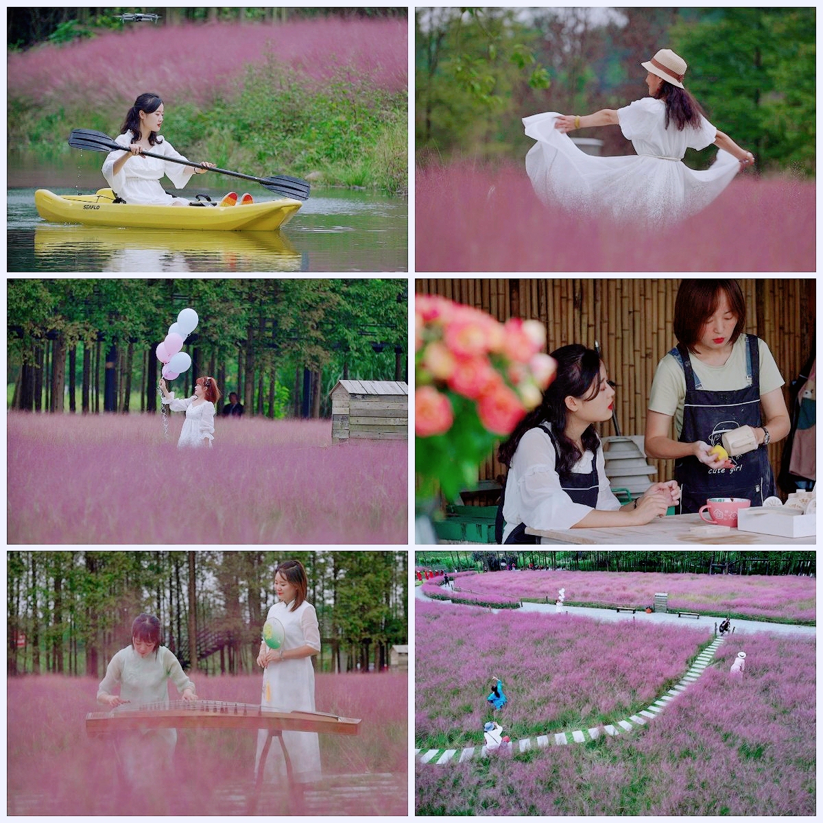 沿着湖边漫步,一边是清澈的湖水,另一边是星星点点的粉黛,草坪、湖水、粉黛……一幅美如画的乡村画卷,仿佛进入了爱丽丝仙境。蓝天白云下,粉黛肆意生长,远远看去就像一团团粉色云朵,梦幻而温柔。坠入无边梦幻粉色花海,自带云雾滤镜,好看又出片!完全用不上美颜!建议大家穿浅色的衣服,超级出片,分分钟引爆朋友圈!穿上汉服在粉黛里抚琴赏景,美得像下凡的仙子,不食人间烟火。