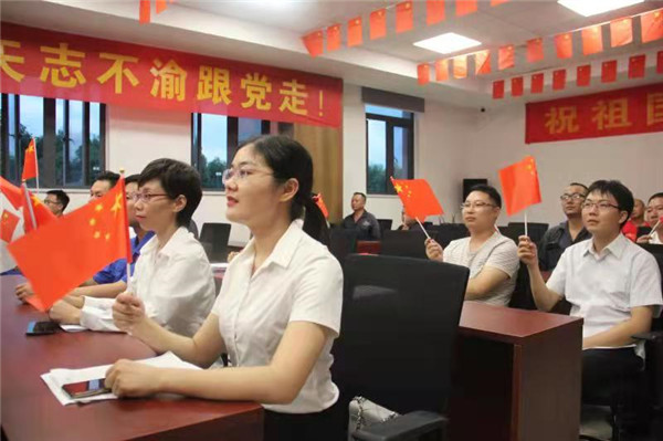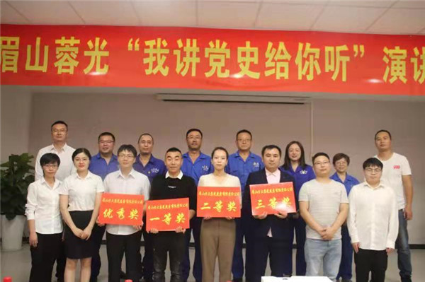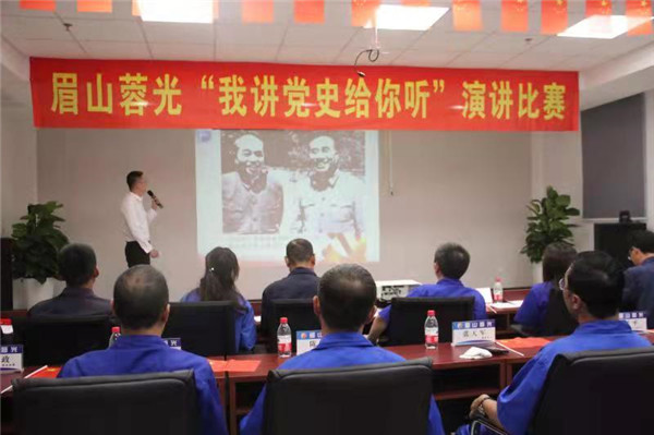 9月29日晚,眉山蓉光“我讲党史给你听”演讲比赛现场横幅悬挂,红旗飘飘,公司领导、评委、参赛者和各分工会代表共60多人在办公楼一楼会议室隆重集会,感受现场满满的爱国心和重重的祝福情。