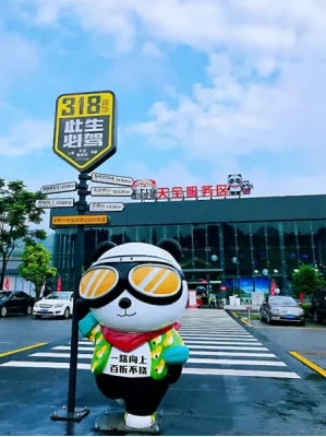 天全服务区主题特色突出,全面融合大熊猫发源地特色文化和G318、川西旅游环线等国家级自驾线路品牌及旅游元素,打造“熊猫家园”和“G318公路文化”两大主题IP,在设计元素、业态设置、场景营造上充分突出主题特色,内外场设置熊猫艺术装置、打卡雕塑、公路精神堡垒、互动游乐设备、主题地绘以及融合熊猫元素的“318此生必驾”导视牌等,创意新颖、主题鲜明。同时,服务区专门设置了蜀道集团川藏公路馆和与四川摄影家协会联合打造的318川藏线美景摄影展。川藏公路馆通过“蜀道难、蜀道通、蜀道畅、蜀道人”四大篇章,全面展示了川藏公路建设、改造以及川藏高速公路建设历程,进一步弘扬了“两路”精神、传承红色基因,凝聚交通发展力量。摄影展涵盖了川藏线云海、雪山等自然风光和涉藏地区民族特色文化,进一步彰显了服务区交旅文融合。