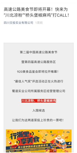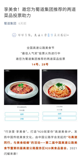 蜀道实业公司收到参赛邀请函后,高度重视,积极组织团队报名参加,共选送6道菜品,其中“川北凉粉”“桥头堡椒麻鸡”顺利入围,于10月20日参加现场厨艺比拼与品鉴,参赛团队还制止了精美展示视频。在网络投票环节,实业公司高度重视,积极发动员工和商家为选送菜品投票,桥头堡椒麻鸡以8万余票位居人气榜第二名。