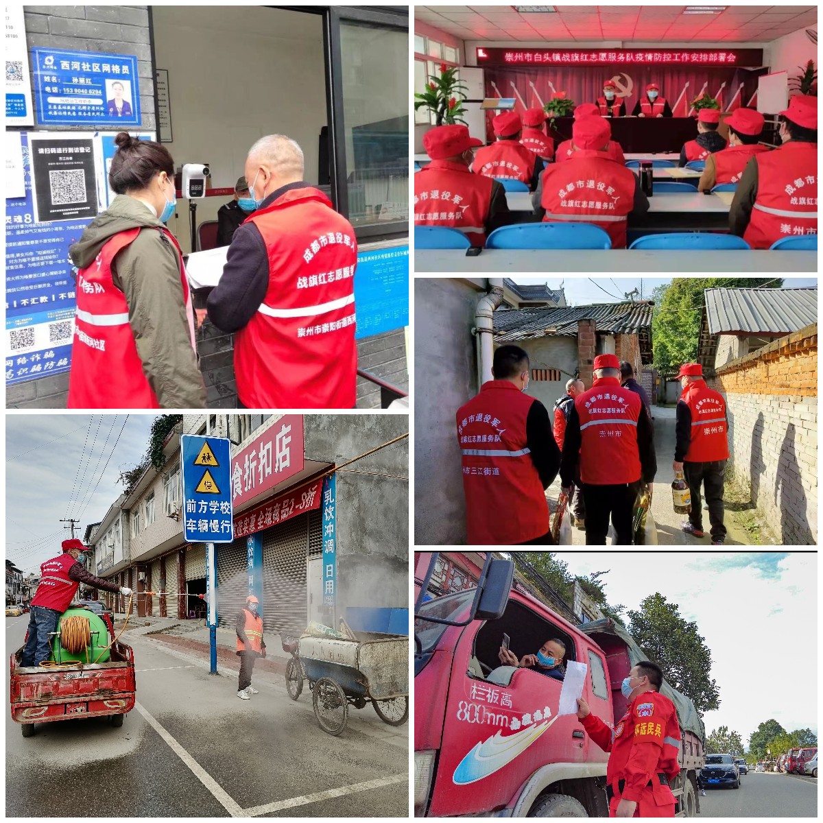 “疫情就是命令,防控就是责任”,面对新一轮的疫情防控工作,崇州市各镇(街道)的退役军人,退伍不褪色,组成战旗红志愿者服务队,主动投入到疫情防控工作中,勇担防疫一线排头兵。他们深入一线,在超市、药店、菜市等人员来往密集场所进行疫情防控督导宣传;他们走街串巷,张贴横幅标语,宣传疫情信息和居家防护措施;他们,分散坚守在重要的防控检测卡点,协助医务人员完成核酸检测采样。