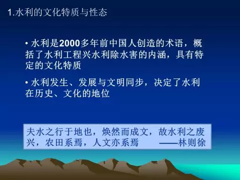 中国水利有悠久的历史,历朝历代从一国之君到州县官员,无不重农桑、兴水利。制度和道德约束,为水利注入了文化和民族精神,并在时间的长河中衍生出独特的文化。