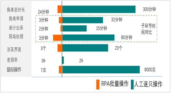 2020年8月成都市金堂城区遭遇50年来最大流量洪峰过境。洪峰过后,居民用电需求迫在眉睫,每天超1000只智能电表需要办理换装流程。国网金堂供电公司迅速响应,1名电力工人用时仅3小时就完成了这项工作,高效保障了居民生活用电。而在以往,这项工作需要5名电力工人10小时不间断工作才能完成。工作效率提高近50倍背后的秘诀也是RPA机器人。