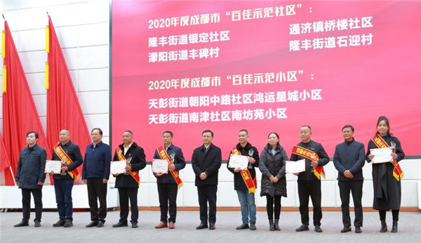 活动上有一个特别的环节--对“成都市百佳示范社区(小区)”进行表彰,隆丰街道银定社区、通济镇桥楼社区、濛阳街道丰碑村、隆丰街道石迎村4个社区获评“成都市百佳示范社区”,天彭街道朝阳中路社区鸿运星城小区、天彭街道南津社区南坊苑小区2个小区获评“成都市百佳示范小区”。