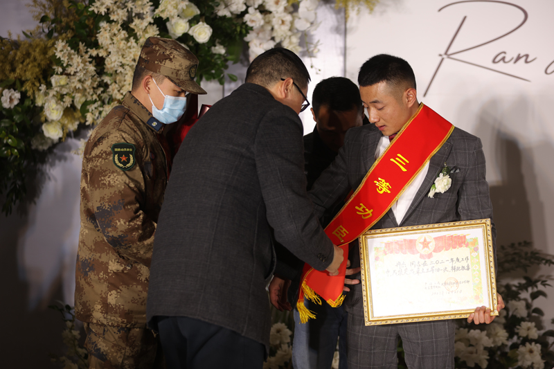 “一人参军,全家光荣;建功立业,家乡荣光。当我们得知冉杰同志于2月回家乡举办婚礼时,便与退役军人事务局、崇阳街道办共同策划了此次婚礼送奖章活动。一是祝愿他们新婚快乐,幸福美满。二是鼓励冉杰再接再厉,再立新功!”崇州市人武部政治工作科干事陈佳容介绍说。