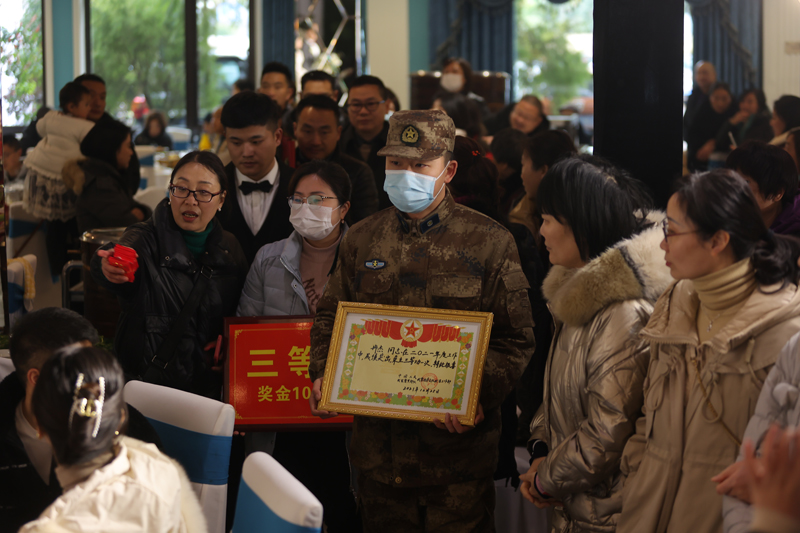 上午11时30分,冉杰婚礼仪式即将举行。这时,酒店外一阵锣鼓声让原本热闹的婚礼现场更加热闹。原来,崇州市人武部会同崇州市退役军人事务局、崇州市崇阳街道办事处组成的送喜报小组,共同为新郎新娘送来了三等功奖章和“四有军士”喜报。