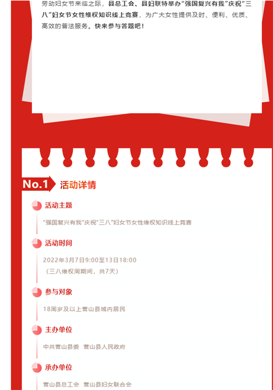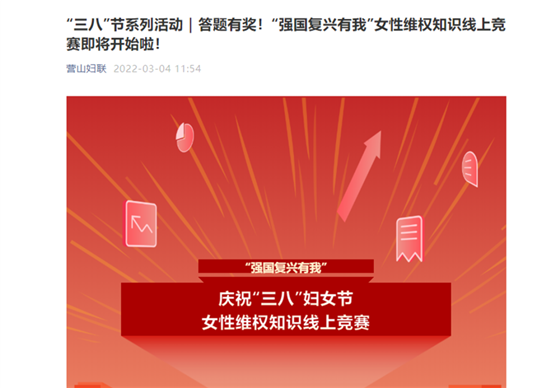 为进一步提高“保障妇女权益”的宣传覆盖面和群众的受教育率,增强广大女性的法律意识和依法维权能力,3月7日—13日,营山县妇联与县总工会组织全县广大职工群众,参加庆祝“三八”妇女节女性维权知识线上竞赛活动,题目内容涵盖《民法典》《反家庭暴力法》《妇女权益保障法》《家庭教育促进法》等法律知识,在全县形成了共同关心和维护妇女合法权益的良好社会氛围。