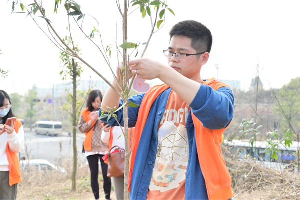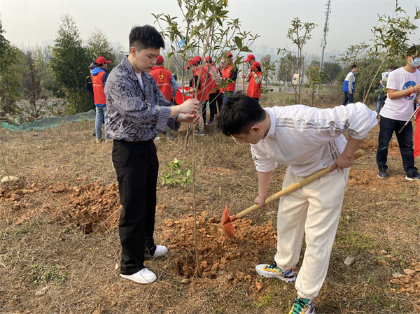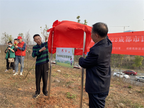 当天10时,主办方在植树现场举办了简短的开幕仪式。成都社会组织党建研究会副会长、高新区志愿者协会党支部书记吴元兵代表主办方致辞并倡导广大公众积极参与植树造林和社区服务,以实际行动参与社区发展治理和新时代文明实践志愿服务。三峡集团移民办团委副书记王腾龙和西南商报党支部纪检委员陶岚代表企业志愿者和媒体发言,并向现场的企事业单位、媒体和广大社会公众发出“参加义务植树,共建公园城市”的倡议,号召广大企业党组织和党团员发挥好政治引领和先锋模范作用,通过公益活动等形式把党员和职工组织起来,广泛参与社区发展治理,共建绿色成都,共享美好生活。随后,举行了志愿者林揭牌仪式。在工作人员介绍植树注意事项后,各单位领队依次排队领取树苗并组织志愿者们拉开了植树的大幕。志愿者们“你挖坑、我扶苗”“你培土、我浇水”,大家分工合作,一个小时左右很快完成既定植树目标。最后,大家还将自己的写有祝福的“心愿卡”挂在所植的树苗上,祝福小树早日成为参天大树。