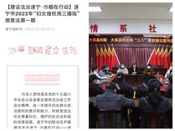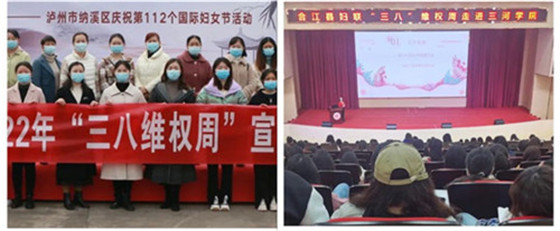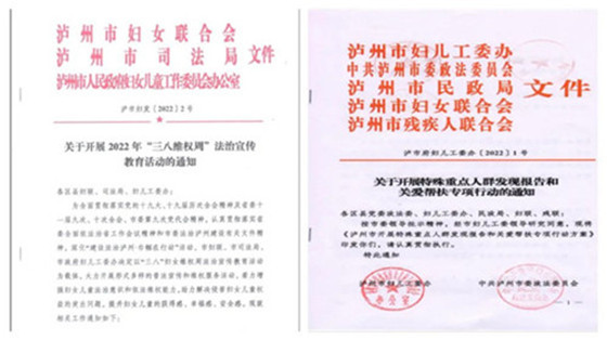 泸州市妇联联合市司法局、市妇儿工委办印发《关于开展2022年“三八维权周”法治宣传教育活动的通知》;联合市妇儿工委办、市委政法委、市民政局、市残联印发《关于开展特殊重点人群发现报告和关爱帮扶专项行动的通知》。线上酒城桂花姐微普法公益讲师作普法讲座,并依托妇联“一网二微三平台”组织开展《家庭教育促进法》网络知识竞赛活动。