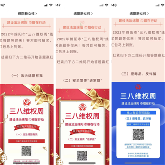 3月8日—10日绵阳市妇联,在微信公众号上推出“法治绵阳有我”“安全宣传进家庭”“拒毒品、反诈骗”三场有奖答题活动,面向广大妇女儿童和家庭宣传安全进家庭、抵制毒品侵害、防范网络电信诈骗等知识,通过寓教于乐的形式,调动广大市民参与,三场活动累计发放奖励金1.5万元,参与人数两万余人。